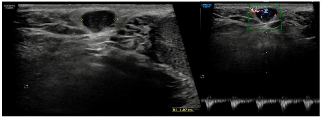 A 45-year-old male, former smoker (2 package index year) with no significant medical history, presented to Internal Medicine in May 2023 with a 4-month history of persistent dry cough and pleuritic chest pain. A chest X-ray revealed an opacity in the right lower lobe, initially of uncertain inflammatory or infectious etiology. The patient also reported a left scrotal lesion, noticed months earlier, presumed to be a lipoma and awaiting excision. A left testicular ultrasound was performed, revealing an oval-shaped lesion measuring approximately 11×5 mm (Figure 1).