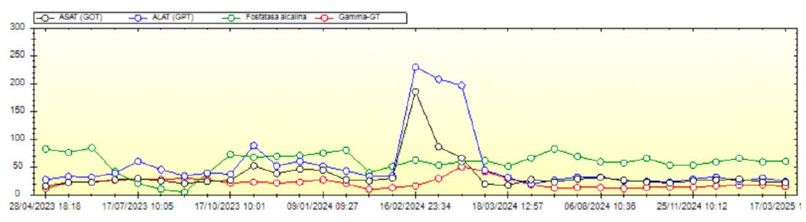 One week after initiating selpercatinib, the patient developed fever of unknown origin, prompting empirical levofloxacin therapy. Within 24 hours, a generalized erythematous rash (sparing palms and soles) appeared. Admitted for suspected toxicoderma (levofloxacin vs. selpercatinib), he presented with febrile neutropenia, thrombocytopenia, and elevated transaminases (Figure 3). Treatment with corticosteroids and antihistamines resolved the rash and fever within four days. Selpercatinib was reintroduced 36 hours after fever resolution during hospitalization, but fever recurred, indicating a probable hypersensitivity reaction.
