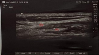 A 49-year-old female patient applied to the medical oncology unit in August 2019 due to a mass in her left breast. After the necessary tests, invasive breast cancer was detected in the biopsy, and breast-conserving surgery was performed. Afterwards, 3 cycles of docetaxel + cyclophosphamide chemotherapy and a total of 60 Gy radiotherapy in 30 fractions were given. Recurrence occurred in the same area in September 2020. After 4 cycles of doxorubicin + cyclophosphamide and 12 cycles of paclitaxel, modified radical mastectomy was performed, and oral capecitabine was started. Approximately one year later, recurrence was detected in the cervical and supraclavicular regions, and 45 Gy radiotherapy in 20 fractions and 6 cycles of gemcitabine were applied. Four weeks after the last chemotherapy, redness, pain, and swelling developed in the left supraclavicular region. In the evaluation made by medical oncology, weakness was detected in the left shoulder and upper extremity. She was referred to our pain clinic for the preliminary diagnosis of radiation-induced brachial plexopathy and pain palliation. On examination, neck deviation to the left, increased left shoulder height, and Sternocleidomastoid (SCM) muscle contracture were detected. Right neck rotation limitation, severe pain on palpation of the neck region, and color change were observed. In addition, there was moderate loss of strength in shoulder abduction and arm extension on muscle strength examination (Figure 1). McGill pain score was 92, and Visual Analog Scale (VAS) score was 9 points. In our Ultrasonography (USG) evaluation, we observed hyperechogenicity in the SCM, trapezius, and scalene muscles (Figure 2). In magnetic resonance imaging, we observed hyperintensity in the T2 phase and contrast enhancement in T1 in the same muscle groups (Figure 3). Gemcitabine treatment was stopped with the diagnosis of gemcitabine-associated radiation recall myositis. We started the treatment with drugs such as prednisolone, ibuprofen, and paracetamol + tramadol. However, despite 5 weeks of treatment, the symptoms did not regress. A 70% loss in sleep quality and daily life activities was observed due to pain. We applied dexamethasone and lidocaine to the SCM, trapezius, and scalene muscles under USG guidance. VAS decreased from 9 to 7 within a week. Afterwards, 100 IU abobotulinum toxin A was applied to the same muscles [8]. After one month, the VAS score decreased to 2. The need for analgesics decreased to 2 tablets of ibuprofen in the last month. The contracture almost completely resolved (Figure 4). The McGill score was measured as 20. Written informed consent was obtained from the patient for publication of this case report and accompanying images.
