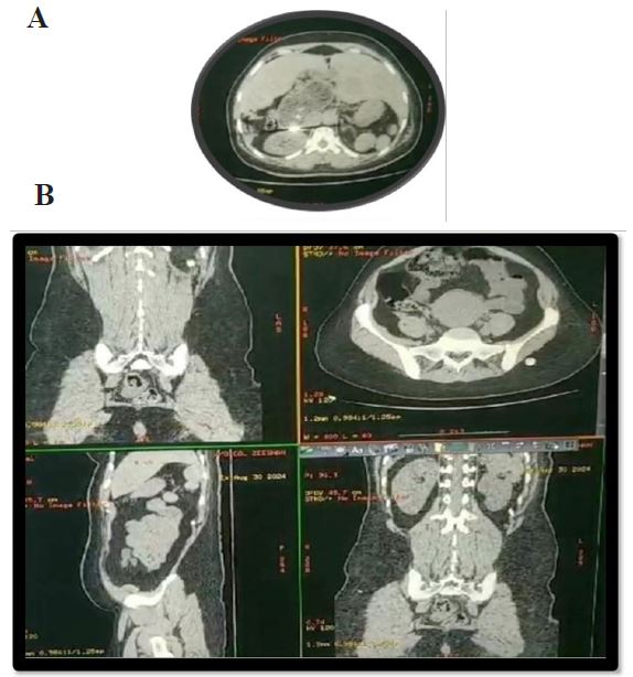 A 34-year-old female presented to the emergency department of CMH Peshawar with a 4-week history of mild gastric fullness and early satiety. She experienced worsening symptoms but reported no abdominal pain, vomiting, or weight loss. Her medical history was unremarkable with no prior abdominal surgeries.