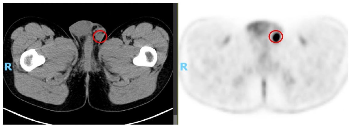 Given persistent respiratory symptoms without evidence of infection, a chest Computed Tomography (CT) scan was conducted, revealing a solid lesion in the right lower lobe suggestive of a primary tumor, accompanied by bilateral hilar lymphadenopathies. Subsequent Positron Emission Tomography-Computed Tomography (PET)-CT demonstrated elevated metabolic activity in the pulmonary lesion, bilateral hilar, cervical, mediastinal, and left inguinal lymphadenopathies, and a probable metastatic left scrotal lymph node (Figure 2).