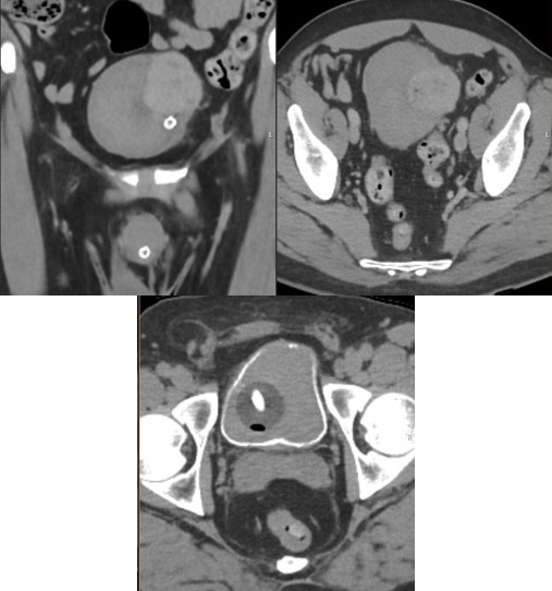 Ureteric stents were inserted in both ureters and externalized for urinary diversion alongside a 3-way urethral catheter with continuous bladder irrigation and patient was transferred to the intensive care unit for close monitoring, stabilization and repeat cross-sectional imaging.